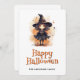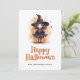 Feliz cartão de Halloween com a ilustração aquática de uma bruxa num chapéu. Personalize facilmente este cartão de Dia das Bruxas fofo para crianças com seu nome e texto de família.