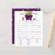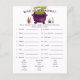 Um cartão de jogo "quem é a minha mãe?", com um chá de fraldas de tema "Quem é a minha mãe?", com uma ilustração do caldeirão de bruxas roxas fumando fumaça verde com velas e poções. Combine o nome do bebê com as mães corretas! Quem tem mais nomes, acerta, ganha! CHAVES DE RESPOSTA: 1.GOOSE=GOSLING, 2.DEER=FAWN, 3.SWAN=CYGNET, 4.ZEBRA=FOAL, 5.KOALA=JOEY, 6.SEAL=PUP, 7.PANDA=CUB, 8.WHALE=CALF, 9.PIGEON=SQUAB, 10.ALLIGATOR=HATLING 11.GORILLA=CRIANÇA, 12.CAT=KITTEN, 13.TURQUIA=POULT, 14.GOAT=KID, 15.FISH=FRY, 16.LLAMA=CRIA
