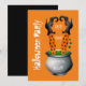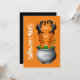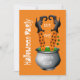 Convite de Halloween fofo e engraçado perfeito para a sua festa de Halloween com uma bruxa de cabeça para baixo em um caldeirão. Cores temáticas preto e laranja. Tema de bruxa fofa.