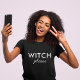 Mantenha-se chique e assustador esta temporada com a nossa camisa de Halloween "WITCH, por favor". Apresentando um texto ousado e moderno com um sotaque de na moda, este design de tendência com feitiçaria é perfeito para festas, truques ou tratamentos ou quedas ocasionais. Uma tenda de Halloween para qualquer um com asas, humor e vibes de bruxa. Disponível em várias cores e estilos.