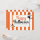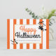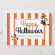 A bruxa e os morcegos listram a carta chata elegante do Halloween. O foco deste moderno cartão de Halloween é uma silhueta e morcegos de bruxas pretas e uma borda de padrão listrado laranja e branco. A sua redação é colocada num quadro branco com contorno dourado.