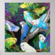 Impressão de uma pintura de bugios ou periquitos coloridos de animais de estimação por Carolyn McFann do Two Purring Cats Studio. Um impressão de poster de excelente para qualquer amante de pássaros.
