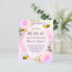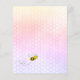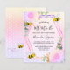 Elegante, divertido, convite para chás de fraldas de verão. Fundo colorido do arco-íris, cor-de-rosa, roxo e ouro, com um padrão de pente de mel. Um quadro geométrico. Decorado com flores e eucalipto verde e abelhas felizes. Com o texto: MOM to Bee o nome da mãe em frente escrito com um moderno estilo escrito à mão. Letras negras. Volta: padrão de mel e uma abelha feliz sorrindo.