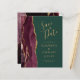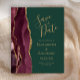 The left-hand edge of this elegant modern wedding save the date card features a burgundy watercolor agate border trimmed with faux gold glitter. The customizable text combines gold-colored handwriting, copperplate and italic fonts on a dark emerald green background. The reverse side features a matching burgundy and gold agate design.