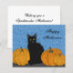 Cartão de Dia das Bruxas com um gato preto, abóboras e texto "Feliz Dia das Bruxas" em fundo azul de bolinhas. Uma maneira divertida e divertida de enviar os desejos de Halloween!