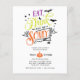 Apresentando as palavras "Coma, Beba, e Seja Assustador" em um esquema de cor roxo, laranja, verde limão e tipografia retrorreflectora, e adornados com morcegos, lua, redes e uma pequena aranha sobre fundo branco esses convites para festas de Halloween são perfeitos para convidar seus amigos e família! Personalize com os detalhes da festa de Halloween em letras brancas em um fundo preto. As cores podem mudar!