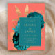 This elegant wedding invitation features a lush, romantic floral bouquet in teal blue with gold faux foil and glitter foliage on a coral background. Customize the gold-colored text in stylish fonts on a teal rectangle. The reverse side is solid coral.