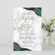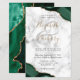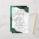 An emerald green watercolor agate design trimmed with faux gold glitter appears in two corners of this elegant design. Personalize it with the couple's names in gold-colored handwriting script over a large gray ampersand. Add the wedding details in black copperplate and italic fonts on a gray and white marble background. The reverse side features a matching green and gold agate design.