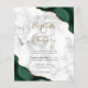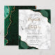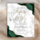 An emerald green watercolor agate design trimmed with faux gold glitter appears in two corners of this elegant design. Personalize it with the couple's names in gold-colored handwriting script over a large gray ampersand. Add the wedding details in black copperplate and italic fonts on a gray and white marble background. The reverse side features a matching green and gold agate design.