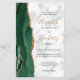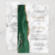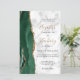 The left-hand edge of this elegant modern wedding invitation features an emerald green watercolor agate border trimmed with faux gold glitter. The customizable text combines gold-colored handwriting and black copperplate and italic fonts on a gray and white marble background. Add additional details on the back, along with a QR code to help your guests visit your wedding website.