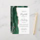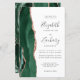 The left-hand edge of this elegant modern wedding invitation features an emerald green watercolor agate border trimmed with faux rose gold glitter. The customizable text combines charcoal gray handwriting, copperplate and italic fonts on a white background. The reverse side features a matching emerald green and rose gold agate design.
