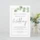 Convite de Casamento de Script de Código QR Eucalyptus de Orçamento. Um convite com preço de orçamento maior em uma variedade de tipos de papel. Cada um é descrito na página do produto. Há um por folha. Adicione seu código QR ao seu site de casamento no verso faz com que esta seja uma opção conveniente para seus convidados para RSVP e veja todos os detalhes sem a necessidade de RSVP separado e cartões de detalhes. Um estilo elegante de escrita manual para o Casamento e o resto do texto que você pode personalizar facilmente. Um galho elegante de verde-aquarela e uma dica de folhas de ouro eucalipto está no topo e uma linha de ouro solteiro borda o texto.