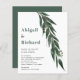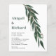 Ramo de eucalipto do ORÇAMENTO com convite de casamento no inverno. Um design para o seu casamento com um galho em cascata de folhas de eucalipto. O fundo é de cor verde.