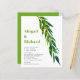 Ramo de eucalipto do BUDGET com folhas em tons verdes convite para o casamento. Um design para o seu casamento com um galho em cascata de folhas de eucalipto. O fundo é de cor verde.