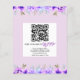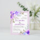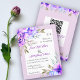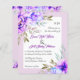 BUDGET, flores roxas de aquarela floral convite para casamento lilás floral com código QR para RSVP. Ele exibe buquês de flores em tons roxos e azuis nos cantos enquanto o texto é colocado em um quadro branco com uma borda lilás. O verso inclui as terras florais nas partes superior e inferior e o código QR para RSVP.