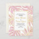 Monstera tropical e palma deixam rosa e ouro para convite de casamento. Mostra um padrão de folhas tropicais com contorno de ouro e seu texto em um quadro branco. O verso inclui um padrão de bolinhas dourada.
