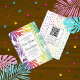 BUDGET A monstera tropical do arco-íris e a palma deixam o convite para casamento de gay e lésbicas com o código QR para RSVP online. Mostra um padrão de folhas tropicais nas cores do arco-íris com contorno de ouro e seu texto em um quadro branco. O verso inclui um padrão colorido de confetti e o código QR. Digitalize para RSVP on-line.