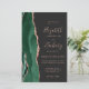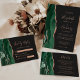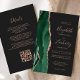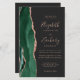 The left-hand edge of this elegant modern wedding invitation features an emerald green watercolor agate border trimmed with faux rose gold glitter. The customizable text combines rose pink handwriting, copperplate and italic fonts on an off-black background. Add additional details on the back, along with a QR code to help your guests visit your wedding website.