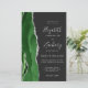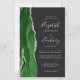 The left-hand edge of this elegant modern wedding invitation features a hunter green watercolor agate border trimmed with faux silver glitter. The customizable text combines silver gray handwriting, copperplate and italic fonts on an off-black background. The reverse side features a matching hunter green and silver agate design.