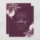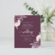 This elegant wedding invitation features mauve floral bouquets set off with silver faux foil greenery in two corners, on a deep mauve purple background. The customizable text combines silver gray serif, italic and handwriting fonts. The floral design is repeated on the reverse side.