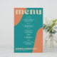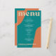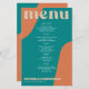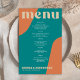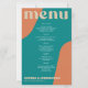 Abstract shapes retro vintage 70s style unique budget affordable wedding menu card with bold typography in a vibrant trendy modern teal, beige tan and orange chic color palette. +++++++ Please note that all the colors are changeable. ++++++++++++ Suitable for informal casual stylish contemporary weddings.
