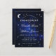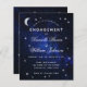 Um noivado de orçamento para um tema de casamento celestial, com a lua e a estrela num fundo azul-noturno estrelado. Os nomes estão escritos em um roteiro caligráfico elegante. A lua e as estrelas são folha de prata falsa, o texto é branco. No preto, há apenas a lua e a estrela num fundo azul-noturno estrelado. A foto noturna estrelada é de Felix Mittermeier, de Pixabay, e está livre para uso comercial.
