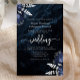 This elegant wedding invitation features navy blue floral bouquets set off with silver faux foil greenery in two corners, on a background image of navy blue watercolor agate. The customizable silver gray text combines serif, italic and handwriting fonts. The reverse side features a matching navy blue and silver floral and agate design.