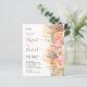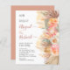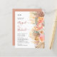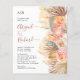 ORÇAMENTO Flores de cor aquosa tropical, folhas de palma e casamento outono de erva de pampas secas. Apresenta um arranjo de palmeiras secas, proteína, rosa e erva-de-palma ao longo do lado direito. O verso inclui um fundo de terracota suave.