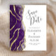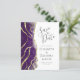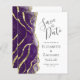 The left-hand edge of this elegant modern wedding save the date card features a purple alcohol ink border trimmed with faux gold foil and faux glitter. The customizable text combines charcoal gray handwriting, copperplate and italic fonts on a white background. The reverse side features a matching purple and gold design.