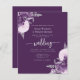 This elegant wedding invitation features purple and lilac floral bouquets set off with silver faux foil greenery in two corners, on a purple background. The customizable text combines silver gray serif, italic and handwriting fonts. The reverse side provides space for wedding details, along with a QR code guests can scan to visit your website and RSVP.