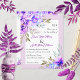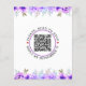 BUDGET, flores roxas de aquarela floral convite para casamento lilás floral com código QR para RSVP. Ele exibe buquês de flores em tons roxos e azuis nos cantos enquanto o texto é colocado em um quadro branco com uma borda lilás. O verso inclui as terras florais nas partes superior e inferior e o código QR RSVP.