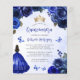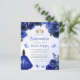 This lovely quinceañera invitation features a border of royal blue roses on a blue watercolor background. A gold tiara, a dark-haired girl in a royal blue princess dress and small blue butterflies decorate the text. The word "Quinceañera" and the name of the guest of honor appear in elegant royal blue handwriting script, with the remaining text in gray sans serif font. Add additional text on the back, along with a QR code to help your guests visit your quinceañera website and RSVP online.