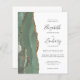 The left-hand edge of this elegant modern wedding invitation features a sage green watercolor agate border trimmed with faux gold glitter. The customizable text combines charcoal gray handwriting, copperplate and italic fonts on a white background. The reverse side provides spaces for 4 photos (1 square, 2 horizontal, 1 long vertical) and room for your wedding website URL or other information.
