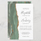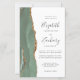 The left-hand edge of this elegant modern wedding invitation features a sage green watercolor agate border trimmed with faux gold glitter. The customizable text combines charcoal gray handwriting, copperplate and italic fonts on a white background. The reverse side features a matching sage green and gold agate design.