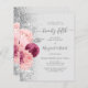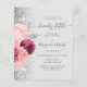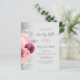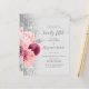 The left-hand edge of this elegant modern 50th anniversary party invitation features a burgundy and blush watercolor floral bouquet trimmed with silver foliage and faux silver glitter. The customizable text combines charcoal gray handwriting, copperplate and italic fonts on a pale gray background. The reverse side features a matching design.