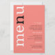 Menu de Casamento da Tipografia do Rosa de Coral Simples. Um preço orçamentário de 5,5" x 8,5", em uma elegante estoque LINEN de 110 lb - para uma sensação de luxo pelo valor do excelente, isso é perfeito para menus, além de convites e programas, etc. Este alternativo de tamanho de orçamento também está disponível em outras opções de papel. O estoque do cartão SEMI-GLOSS de 110 lb tem aproximadamente a mesma espessura do cartão postal, portanto também funciona bem para convites. O papel FELT de 100 lbs é colorido por buff, NÃO branco, então adiciona um toque rústico. O estoque de papel MATTE de 80 lbs é branco brilhante, para impressão nítida, excelente para os menus e programas, enquanto o papel SATIN de 80 lbs é fino e leveUm design tipográfico moderno com Menu em letras grandes em branco com o "n" em preto rodado e no lado esquerdo em um fundo de rosa de coral bonito rosa.
