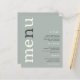 Um valor para o alternativo do ORÇAMENTO em tamanho menor de 4,5 x 5,6" de semirbrilho de 110 lbs, que é de espessura semelhante a um cartão postal (no entanto, não é adequado para uso como cartão postal). POR FAVOR, NOTE que existe UM por folha. Menu de Casamento Simples de Texto de Imersão. Um moderno design tipográfico com Menu em grande tipografia em Ivory com o "n" em cinzas, rotacionado e à esquerda sobre um fundo de sábio verde-claro. As cores de fundo e texto podem ser alteradas se você desejar, por meio de Personalizar mais.