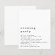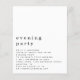 Simples Festa de Casamento de Texto à Noite Convidada. Um alternativo de 4,5 pol x 5,6 pol com preço inferior. Disponível em um STOCK DE CARTÃO SEMI GLOSS 110 lb, que é a opção padrão (recomendada para convites), OU um STOCK DE PAPEL THINNER SATIN FINISH 80 lb (ideal para gabinetes). Os envelopes são um extra opcional e são ligeiramente maiores que o tamanho da placa.O cabeçalho está em na moda grande minúscula com os detalhes abaixo e muito espaço em branco em forma quadrada para um estilo contemporâneo. Personalize facilmente o texto para seus próprios detalhes.
