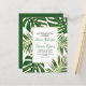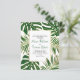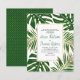O verde tropical e a monstera do ouro e a palma deixam o convite para o casamento. Mostra um padrão de folhas tropicais com contorno de ouro e seu texto em um quadro branco. O verso inclui um padrão de bolinhas dourada.