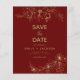 Flores Botânicas de Folha de Ouro Modernas e Elegantes Salvem o Convite de Casamento de Data. O cartão de convite para salvar a data inclui mais tipografia de script e chic floral de ouro e design simples em um fundo Burgundy é perfeito para enviar seu anúncio de noivado para familiares e amigos.