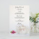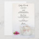 Personalize o elegante Menu de Casamento de Teapot e Roses Rosa com os detalhes da refeição que você servirá no almoço de chá de panela da sua festa de chá de jardim, poste o brunch de casamento ou o janto de recepção de casamentos, adicionando a salada ou o primeiro curso, a entrada ou o segundo curso e a sobremesa ou o terceiro curso. Personalize-o com os nomes da noiva e noiva, local de evento e data. Este clássico menu de casamento de chá alto, personalizado, apresenta uma fotografia floral de um pote de chá florido e flores rosa rosa cor-de-rosa com cebola branca.