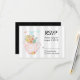 Uma placa RSVP com uma ilustração química. Um bule cor-de-rosa com um pequeno coração cor-de-rosa no centro e um buquê de flores. Delicar borboletas coloridas com sabor a flecha. Colocado sobre uma cinza e fundo listrado branco.