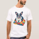 Esta design de camiseta atraente apresenta uma ilustração do Bulldog Francês muito detalhada em preto clássico e branco, descansando confortavelmente sobre uma almofada alegre de retalhos. O francês é rendido com um realismo espantoso, capturando os ouvidos distintivos do morcego, os olhos castanhos expressivos e as características faciais carinholas. A almofada colorida sob o cão apresenta um padrão geométrico vibrante em lacas, vermelho-coral e amarelo, criando um contraste perfeito com a coloração monocromática do cão. O sombreamento detalhado e a textura dão vida ao cão e à almofada, fazer este pop design em qualquer cor de camisa.