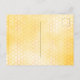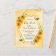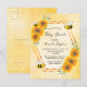 Elegante, chá de fraldas divertido, neutro em relação ao gênero. Fundo amarelo com um padrão de colmeia de ouro. Com uma falsa estrutura geométrica dourada. Amarelo, girassóis cor de laranja e abelhas-deslumbradas. Com o texto: Chá de fraldas e o nome da mamãe a ser gravada na frente com um moderno script de estilo escrito à mão. Letras negras. Volta: padrão amarelo de mel. Dica: Se você não quiser que pareça um cartão postal, clique em personalizar, vá para o verso e remova o divisor e o carimbo de posto.
