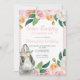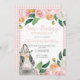 Um coelho está fazendo um convite de aniversário de rosa e floral com gingham de volta.
