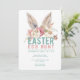 Este divertido convite para Caça de Ovos da Páscoa apresenta orelhas de coelho moldadas em água sobre as palavras "Caça de Ovos da Páscoa". Todos os detalhes do convite estão diretamente abaixo em um fundo branco brilhante. O verso é uma cor azul aqua coordenadora.