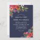 Convite de casamento floral azul escuro com arranjos de flores desenhadas à mão em combinações de cores lindíssimas — verde-oliva com cor laranja e rosa quente e coral e azul-marinho — combinado com fontes brancas modernas. A parte traseira apresenta um borrão de confete branco contra um tom de borra. Convite floral perfeito para um casamento outono ou casamento no inverno.
