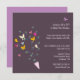 Convite de festas de despedida personalizado com um buquê de borboletas contra fundo roxo e uma borboleta voando para longe.