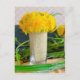 Buquê de dentes-de-leão amarelo vivo num copo alto cheio de grão. Folhas verdes brilhantes enquadram a composição.