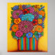 Vibrante Pintura Estilizada de um buquê floral colorido num vaso colorido listrado correspondente pela artista popular Lisa Lorenz.